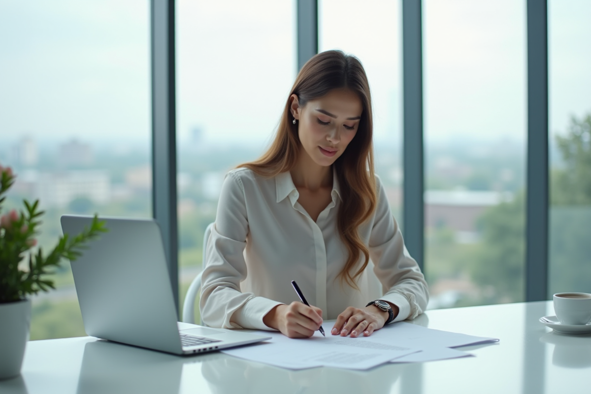Femme d'affaires signant un contrat de prêt dans un bureau lumineux