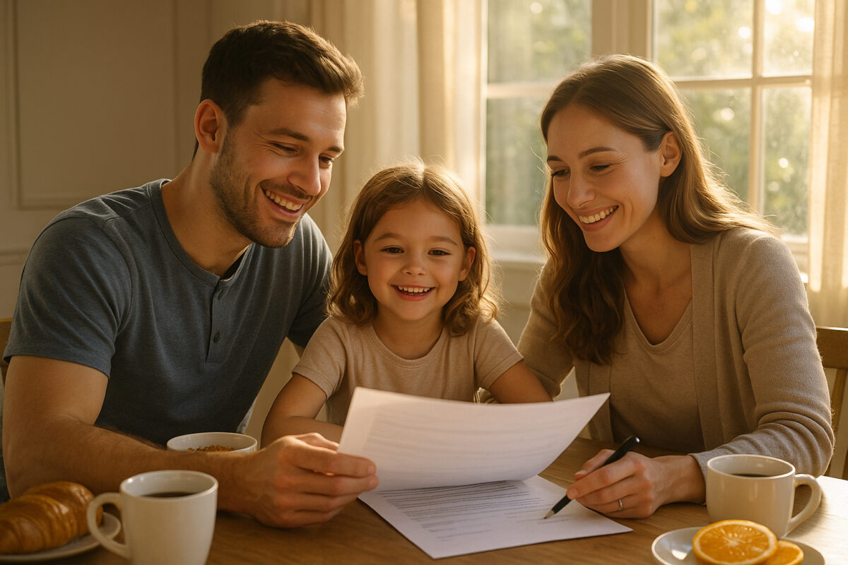Famille souriante autour du petit déjeuner pour la planification financière